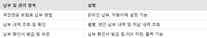 국민연금 보험료를 온라인으로 납부하고, 납부 내역을 조회할 수 있습니다. 이를 통해 사업주는 매달의 국민연금 부담금을 쉽게 확인하고 관리할 수 있습니다.