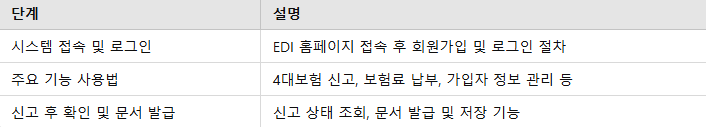 EDI 시스템을 통해 4대 보험 신고와 처리 절차를 빠르게 진행할 수 있으며, 인사 담당자는 이를 통해 직원의 입 퇴사 및 소득 변동 시 업무 처리를 효율적으로 할 수 있습니다.