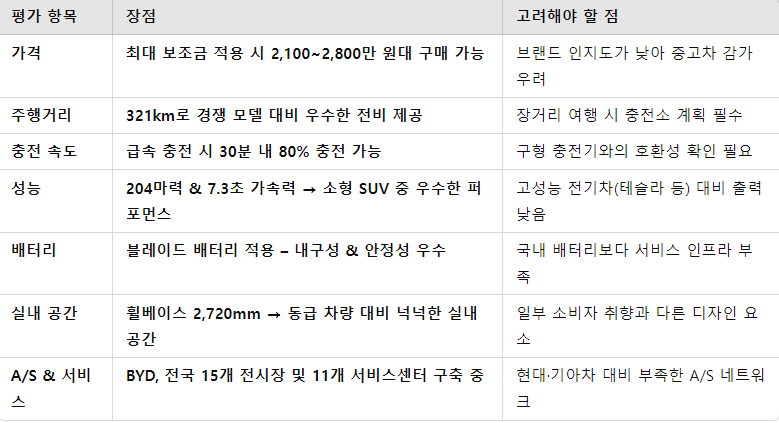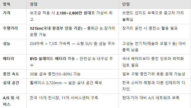 📌 BYD 아토 3은 가격 대비 성능, 주행거리, 충전 속도가 우수하지만, 브랜드 인지도와 A/S 인프라가 상대적으로 부족한 점 고려 필요