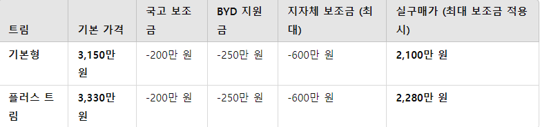 ✅ 보조금 적용 시 2,100만 원대 실구매 가능 – 동급 차량 중 가장 가성비 우수