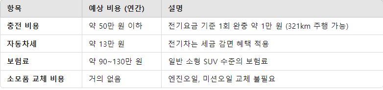 📌 내연기관 SUV 대비 연간 약 100~200만 원 절약 가능