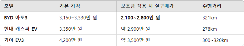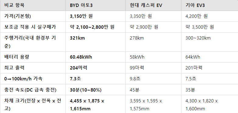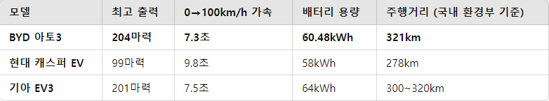 📌 결론 – BYD 아토 3, 경쟁 모델 대비 장점 요약