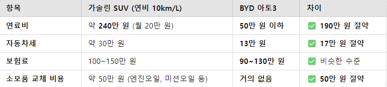 ✅ 연간 유지비 비교 (가솔린 SUV vs BYD 아토 3)